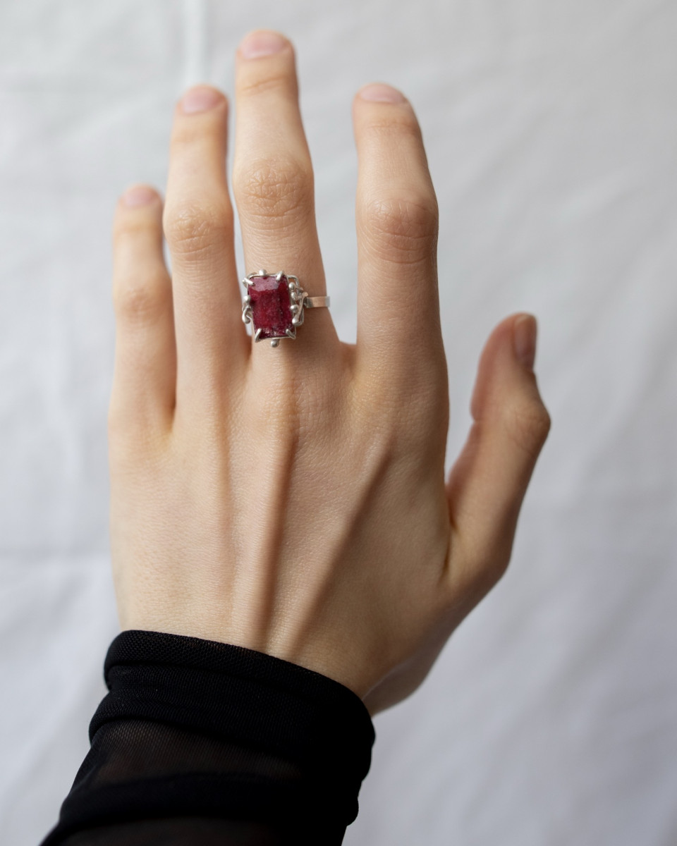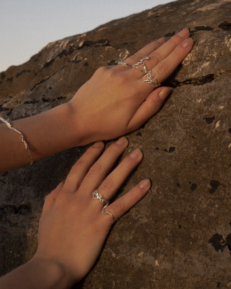 Ak sa prvá kapitola Nikolinho príbehu končí objavením kovu ako súčasť autorského jazyka, tá druhá sa začína intenzívnym dialógom s materiálom. Pre ňu totiž šperk nevzniká na papieri, ale v rukách. „Veľakrát som si aj skicovala, ale oveľa viac ma bavilo už priamo robiť s materiálom,“ priznáva a tým sa jasne vymedzuje voči dizajnu, ktorý je striktne naplánovaný od prvého ťahu ceruzky. U nej prichádza nápad často až počas procesu – pri tavení, modelovaní, vrstvení, skúšaní. Spomína moment, keď dostala staré, rozbité šperky od mamy a rodiny a namiesto nostalgického odkladania ich začala taviť. „Postupne som ich na seba ukladala a keď sa roztavili, vytvorili nepravidelný tvar, ktorý mi vždy niečo pripomenul,“ opisuje. Tento spôsob práce je intuitívny, ale nie náhodný – materiál sa stáva spoluautorom. V roztavenom striebre začína vidieť rastlinu, koral, fragment prírody. A práve tu sa organické motívy zo strednej školy naplno prelievajú do kovu. Striebro je dnes jej najbližším médiom. „Najviac ma asi baví to striebro… mám pocit, že aj najviac zachytáva to, čo chcem vyjadriť,“ hovorí. Zlato používa najmä na zákazky, napríklad pri zásnubných prsteňoch, no vníma ho ako farebne dominantnejšie, intenzívnejšie. „Keď sa skombinuje s kameňom, vie potlačiť samotný kameň,“ vysvetľuje a tým opäť odhaľuje svoj cit pre rovnováhu. Striebro jej umožňuje nechať vyniknúť štruktúru, prírodninu, detail. Nejde jej o lesk luxusu, ale o charakter. V jednej z posledných kolekcií sa dokonca vedome vyhla dokonalému vyhladeniu povrchu. „Snažila som sa, aby to nebolo také lesklé… chcela som zachytiť čo najviac surovosť.“ Opilníkované ryhy, zámerné nerovnosti, priznané stopy nástroja – to všetko je súčasťou estetiky, ktorá stojí bližšie k prírodnému fragmentu než k sterilnej vitríne.