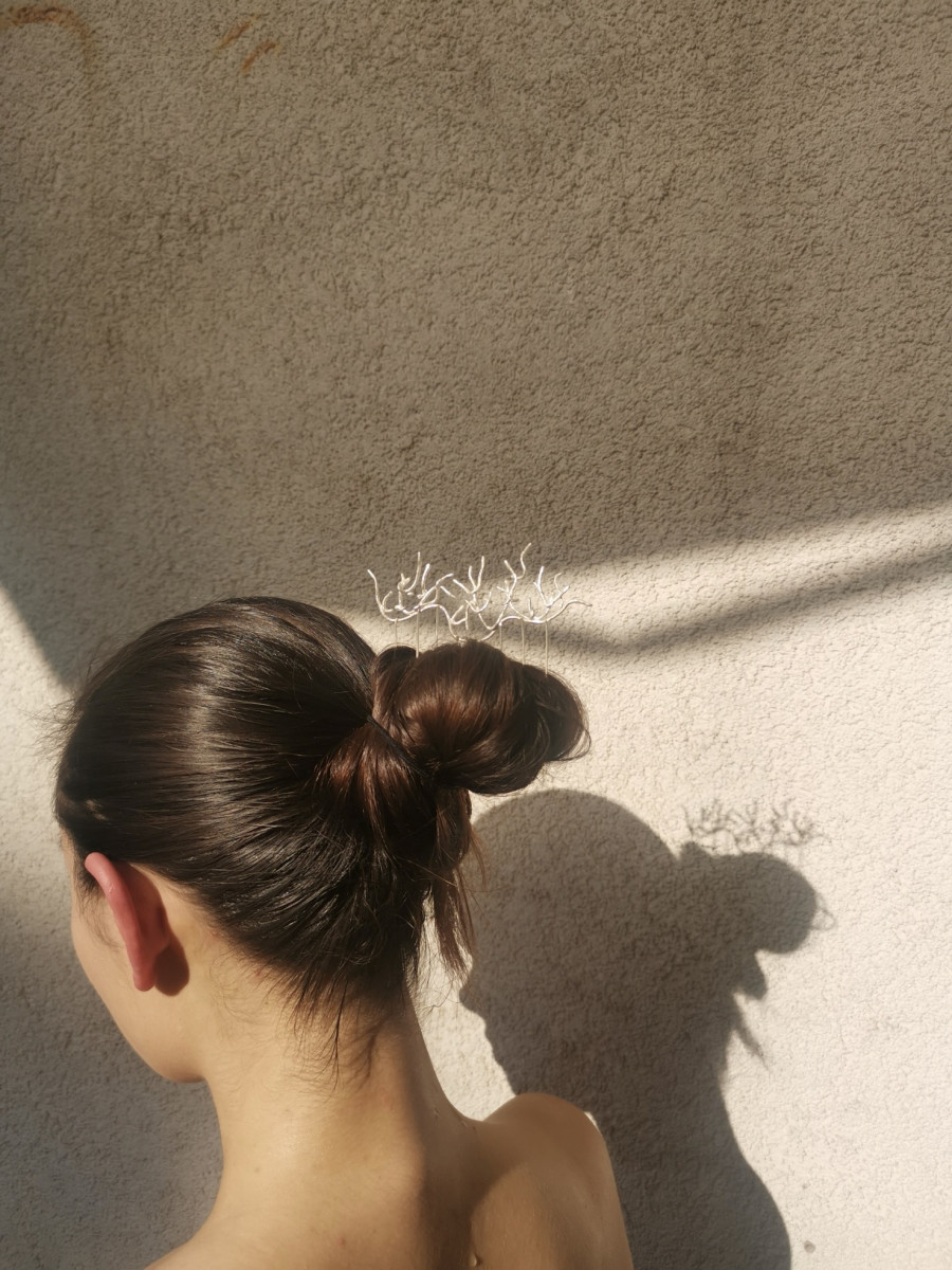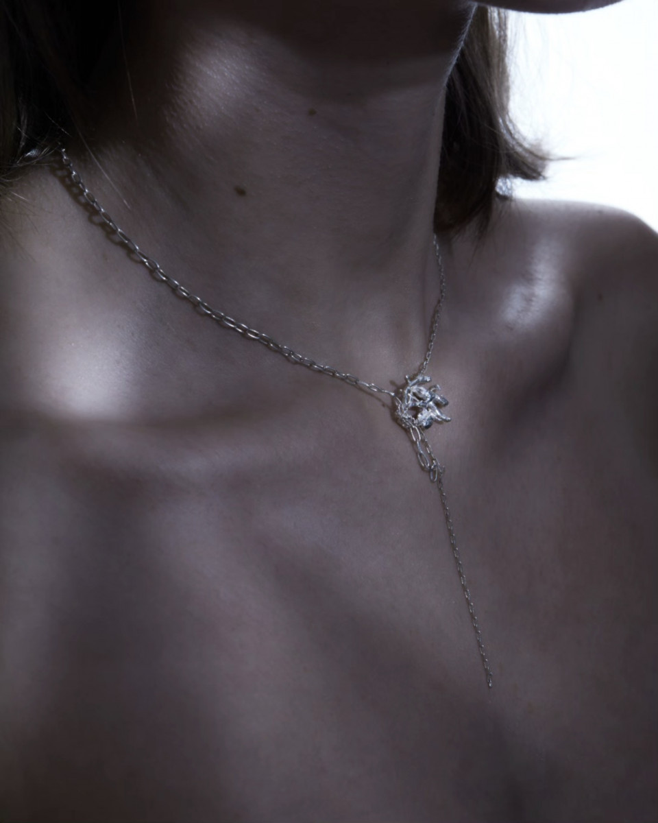 Značka Hanzelova atelier dnes nestojí len na individuálnych kusoch zo striebra, ale aj na schopnosti posúvať vlastný jazyk ďalej – skúšať, prepájať, otvárať sa novým materiálom aj ľuďom. Nikol sa neuzatvára do ateliéru ako do nepreniknuteľnej bubliny. Naopak, spolupráce ju prirodzene priťahujú. Spomína spoločnú kolekciu The Primal Skin* s Ninou Valičkovou (Holy Morda), ktorá ju vyviedla z komfortnej zóny kovu a prírodných fragmentov. „Kolekcia bola zameraná na kože… z rôznych secondhandových materiálov, z kabeliek sme robili náhrdelníky alebo kusy cez celé telo,“ opisuje projekt, ktorý pracoval aj s oceľou a ktorý sa pohyboval na hranici šperku a objektu. Niektoré kusy sa nosili cez chrbát, iné fungovali ako výrazné telové artefakty. Bola to skúsenosť, ktorá jej ukázala, že šperk nemusí byť vždy len drobným detailom, ale môže vstupovať do priestoru tela výraznejšie, takmer performatívne. Zároveň však ostáva verná svojej línii – prírode, surovosti, materiálu. Aktuálne pracuje na kolekcii Siren**, v ktorej sa vracia k zubom a kombinuje ich s textilom, no necháva si priestor pre proces. „Je to ešte v procese… uvidím, ako to vyjde,“ hovorí s pokojom, ktorý prezrádza, že sa nikam neponáhľa. Jej kolekcie nevznikajú ako sezónne dropy, ale ako vrstvy – jedna vychádza z druhej, vyvíja sa, mení tón. Raz je to éterická jemnosť, inokedy vedomá surovosť s pilníkovými ryhami. No vždy ide o dialóg medzi prírodou a kovom, medzi kontrolou a náhodou.