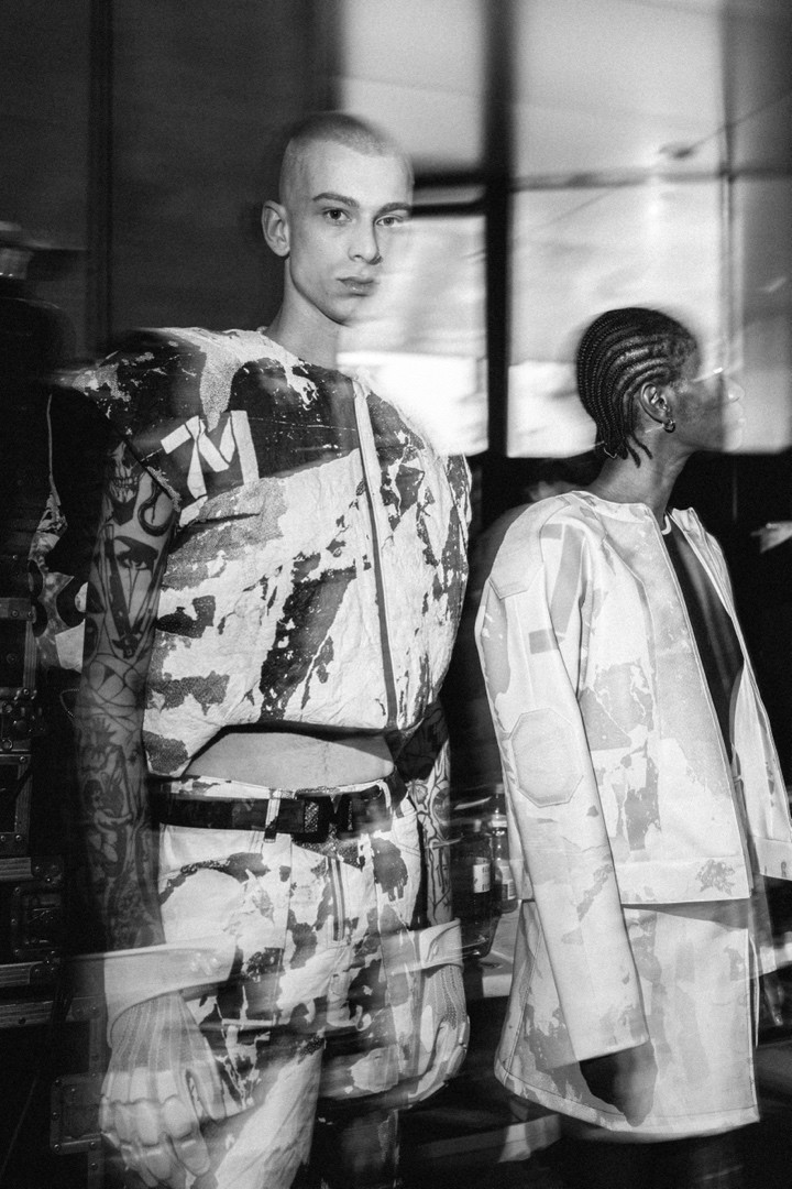 Oxidácia: Keď železo rozpráva. Už počas štúdia v Londýne experimentoval s vlastnými technológiami. V jednej z kolekcií vytvoril unikátne potlače pomocou železných pilín a reaktívneho soľného roztoku, ktorý spôsobil oxidáciu priamo na textílii. Vznikli tak vzory, ktoré neboli len vizuálne efektné, ale aj materiálovo živé – menili sa časom, stárli spolu s odevom, akoby dýchali. „Chcel som, aby sa tie veci menili. Aby žili. Ako betónová fasáda, ktorá za roky očerní. To je pre mňa krásne.“ Tieto textilné pokusy reflektujú jeho fascináciu brutalizmom nie len ako architektúrou, ale ako filozofiou materiálu. To, čo je hrubé a neopracované, môže byť nositeľom štruktúr, ktoré majú emocionálnu silu.
