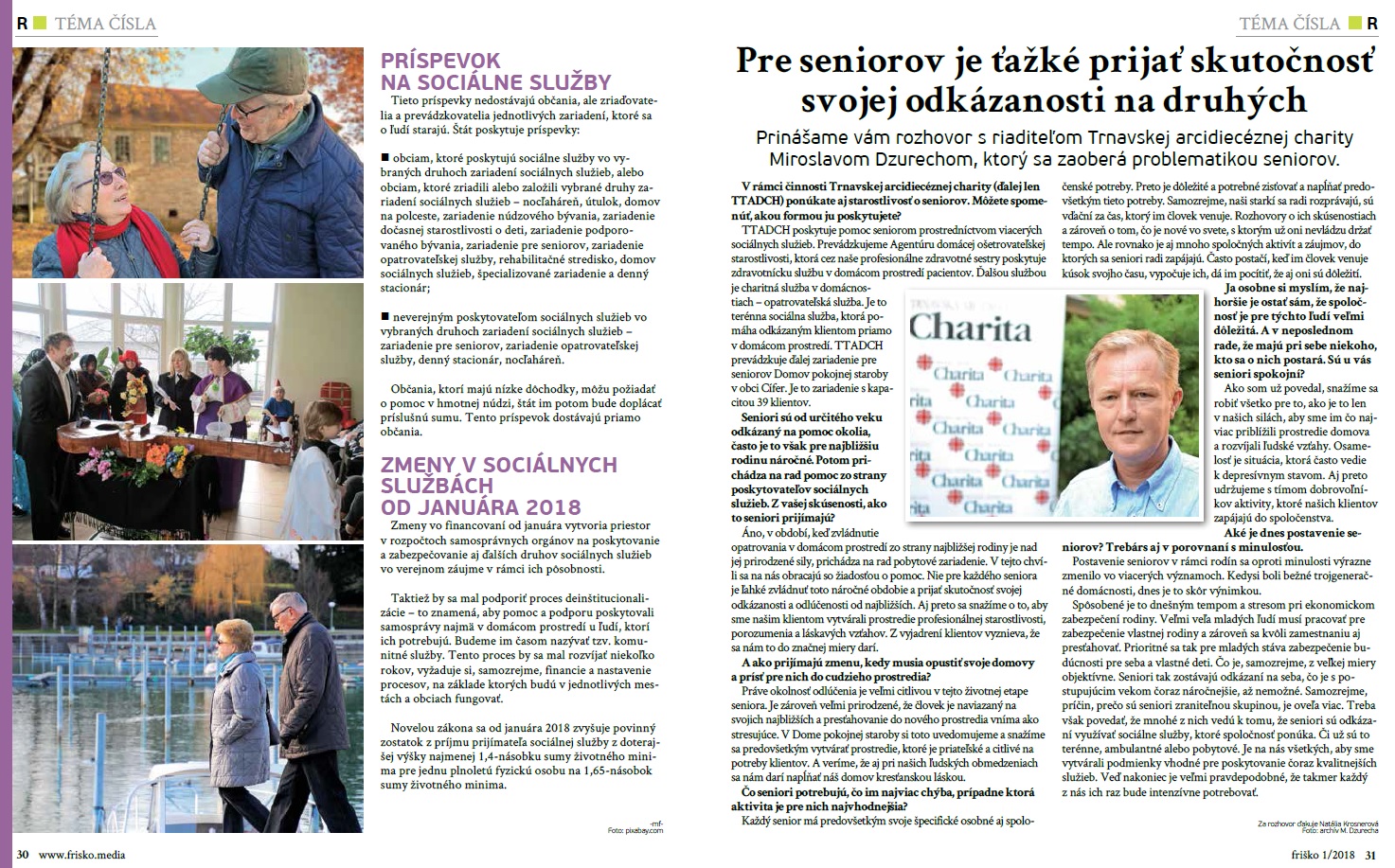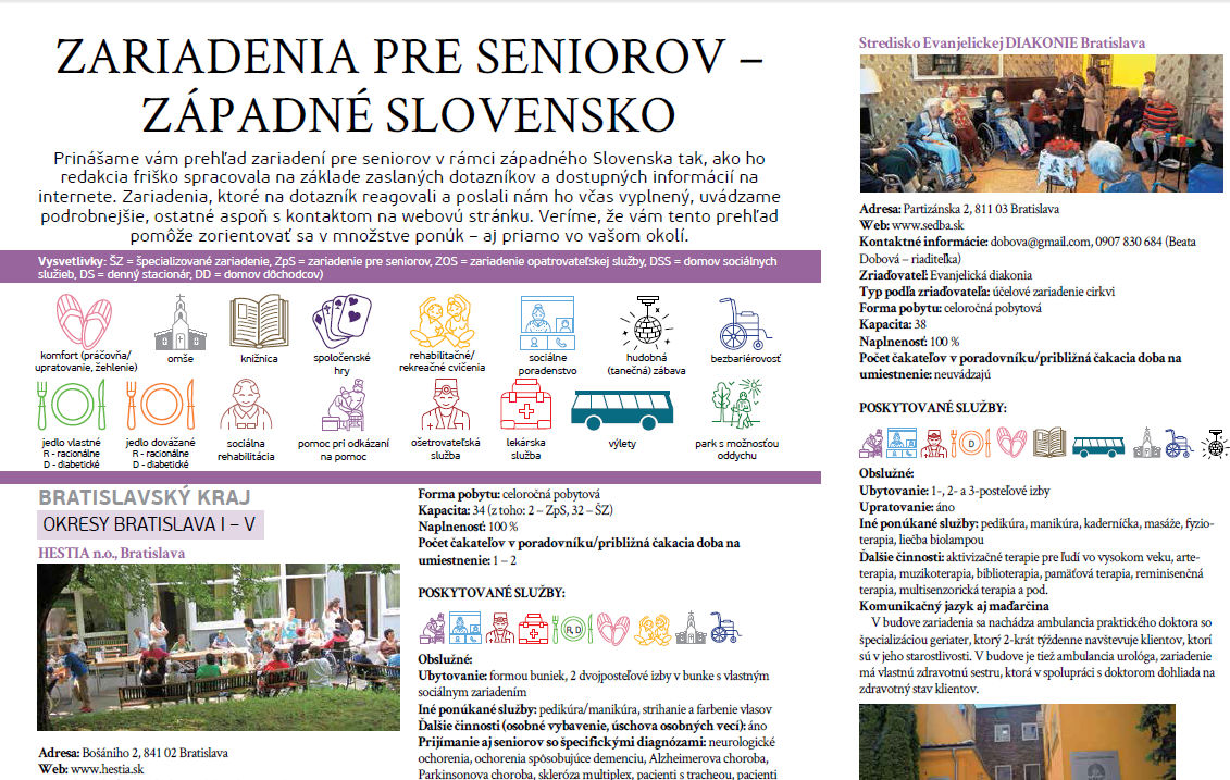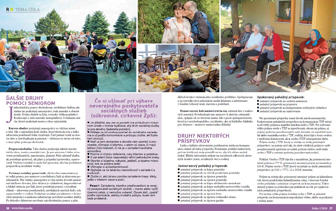 V spolupráci s redakciou časopisu Friško sme spracovali a prinášame komplexný prehľad sociálnych služieb a zariadení pre seniorov na území západného Slovenska. Podpora sociálnej oblasti je jedna z hlavných tém KRR, pričom zorientovať sa v tejto téme nie je vôbec jednoduché. Témy sú autenticky spracované v aktuálnom vydaní časopisu Friško, II. ročník, jar 2018 na stranách 25 až 53 a je to doposiaľ najobsiahlejší publikovaný dokument v takejto forme. Veríme, že mnohým pomôže v zorientovaní sa v problematike a našou ambíciou je, aby sme do spolupráce pri spracovaní elektronickej verzie prehľadu sociálnych zariadení a tém zapojili čo najviac aktérov, ktorí sa sociálnym službám venujú profesionálne ale aj tých, ktorí sú ochotní akokoľvek pomôcť. Kompletný článok nájdete aj na internete TU.