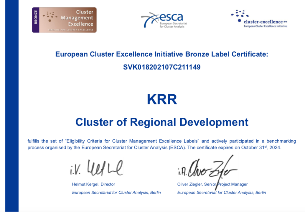 Klaster regionálneho rozvoja splnil súbor kritérií oprávnenosti na získanie bronzovej značky excelentnosti riadenia klastrov. Opätovne tak potvrdil svoju pripravenosť na napredovanie v zlepšovaní kvality riadenia a postupov, pričom obhájil BRONZE LABEL z roku 2019. Súčasný certifikát bude platný do roku 2024. KRR sa aktívne sa zúčastňoval procesu benchmarkingu organizovaného Európskym sekretariátom pre klastrovú analýzu (ESCA) a za úzkej spolupráce, podpory a pomoci zo strany Slovenskej inovačnej a energetickej agentúry (SIEA) sme boli opätovne schopní získať túto významnú značku excelentnosti. Medzinárodná certifikácia resp. recertifikácia má za cieľ zvýšiť kvalitu riadenia a prístupu k špecializovaným dátam v oblasti ich pôsobenia.