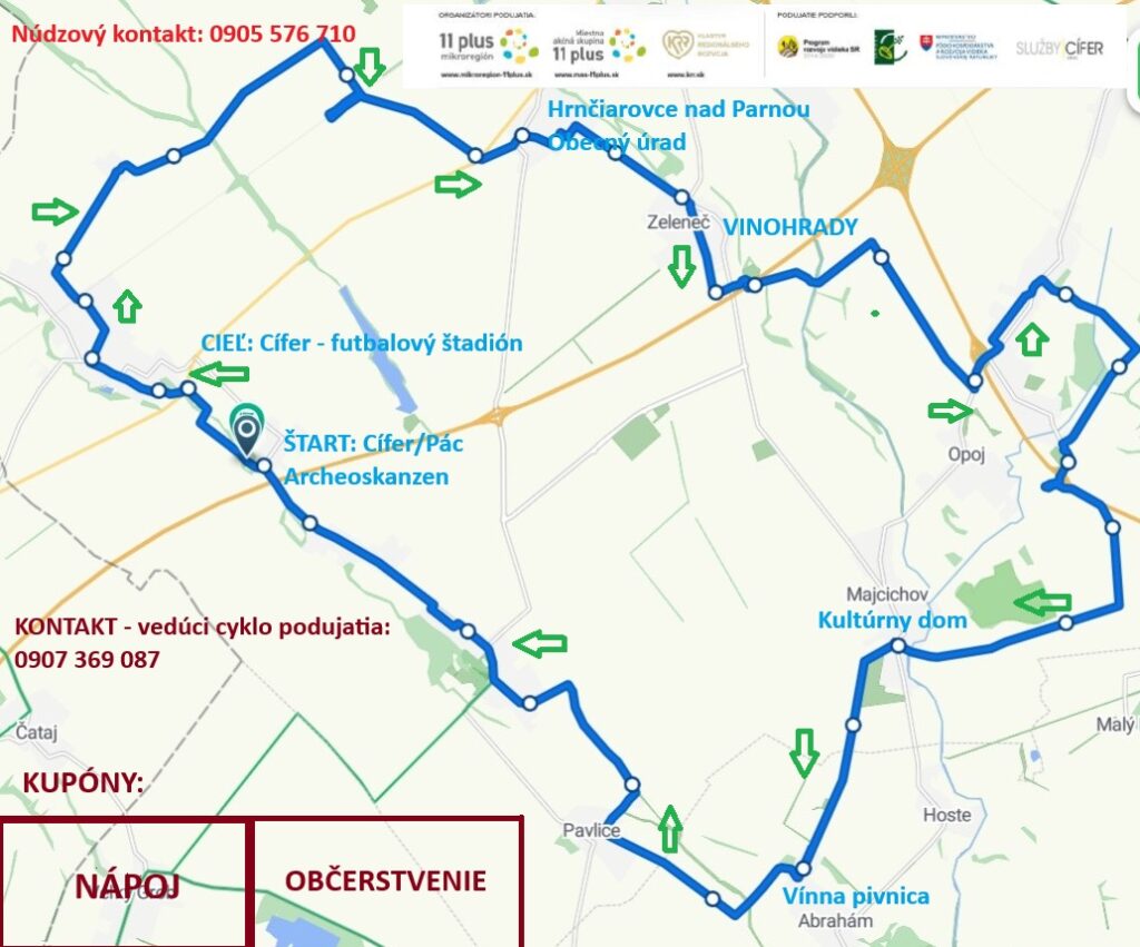 Začíname v Cíferi, smer Karlov Dvor, potom Hrnčiarovce nad Parnou, Zeleneč, Majcichov, Abrahám, Pavlice a cez Voderady a Slovenskú Novú Ves na cieľovú destináciu v Cíferi.