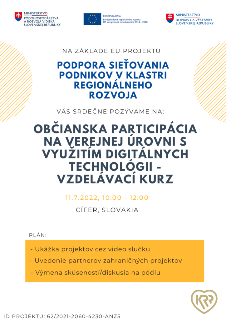 V rámci projektu “Podpora sieťovania a podnikov v klastri regionálneho rozvoja” sa bude 11.7.2022 v kultúrnom dome v Cíferi, konať vzdelávací kurz, s názvom “Občianska participácia na verejnej úrovni s využitím digitálnych technologii – vzdelávací kurz.” Na tomto podujatí bude prítomných viacero starostov, podnikateľov, zástupcov samospráv, partnerov a občanov.